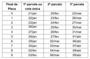 O prazo para pagamento começa em 21 de janeiro, data em que vencem a cota única e a primeira parcela para veículos com placas terminadas em 0.