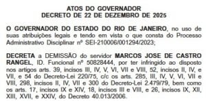 O governador Cláudio Castro (PL) demitiu, nesta terça-feira (23), o policial penal Marcos José de Castro Rangel. O decreto saiu no Diário Oficial do Estado.