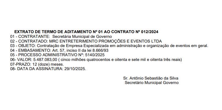 O contrato foi firmado no mês passado com a empresa MRC Entretenimentos Promoções e Eventos, sem licitação, e publicado na quinta-feira (6) no Diário Oficial da cidade.