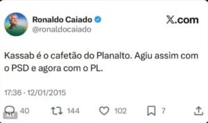 Na ocasião, Caiado acusou Kassab de cooptar parlamentares e disparou: chamou o dirigente de “cafetão do Palácio do Planalto”, afirmando que ele tratava deputados como “garotas de programa” para fortalecer sua base política.